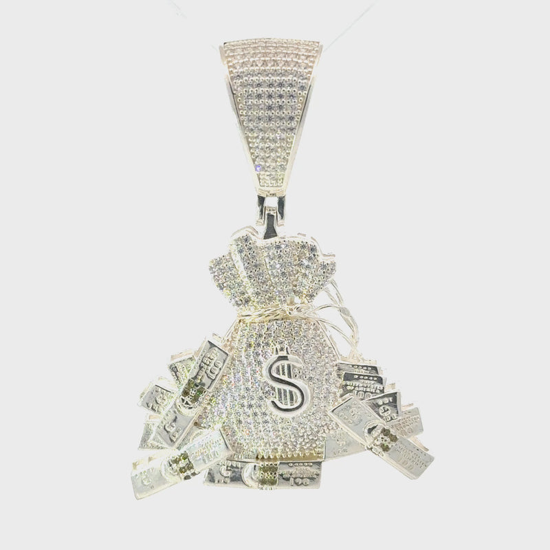 Der Anhänger zeigt einen kunstvoll gestalteten Geldsack mit realistischen Falten und Konturen.